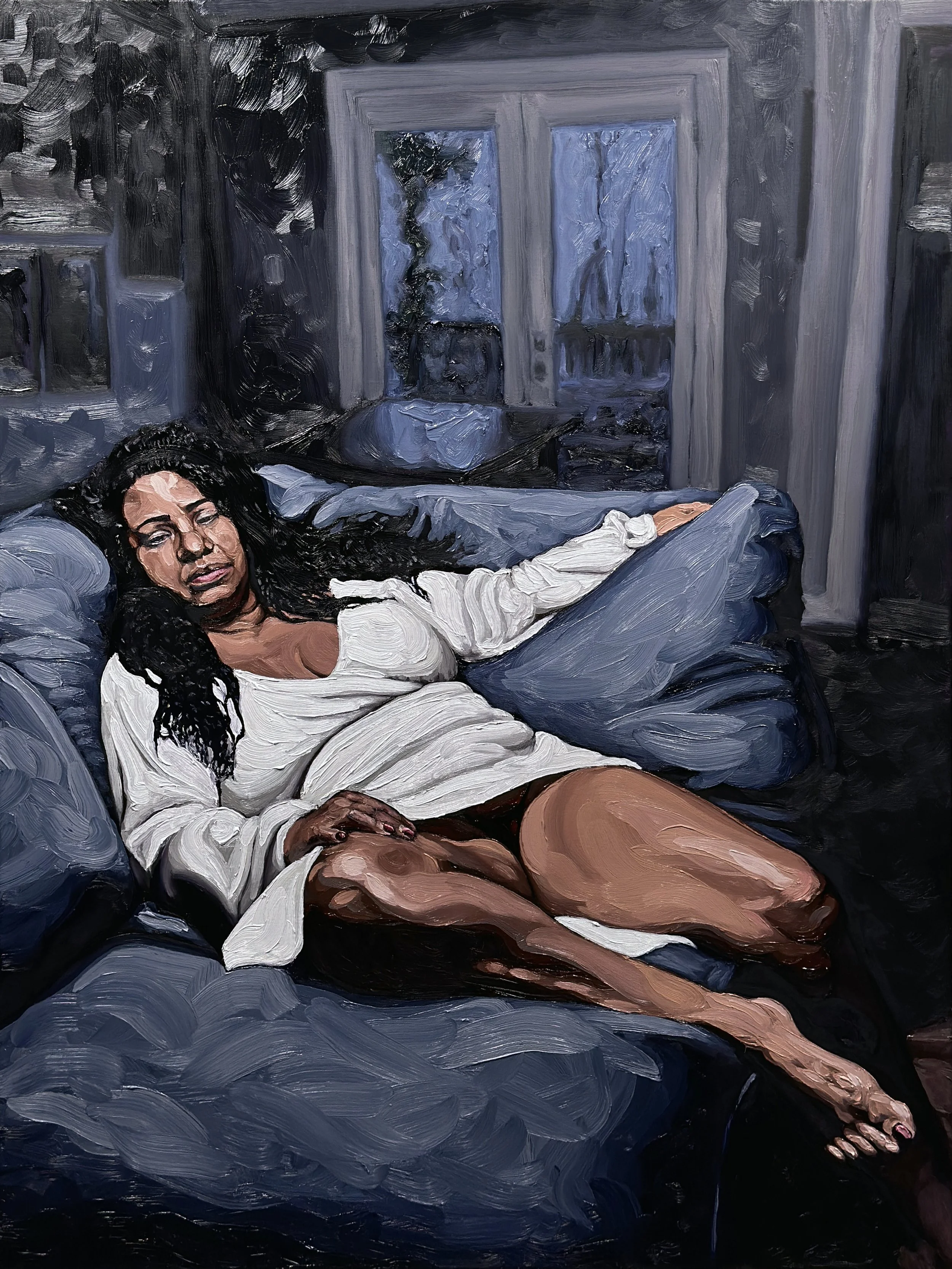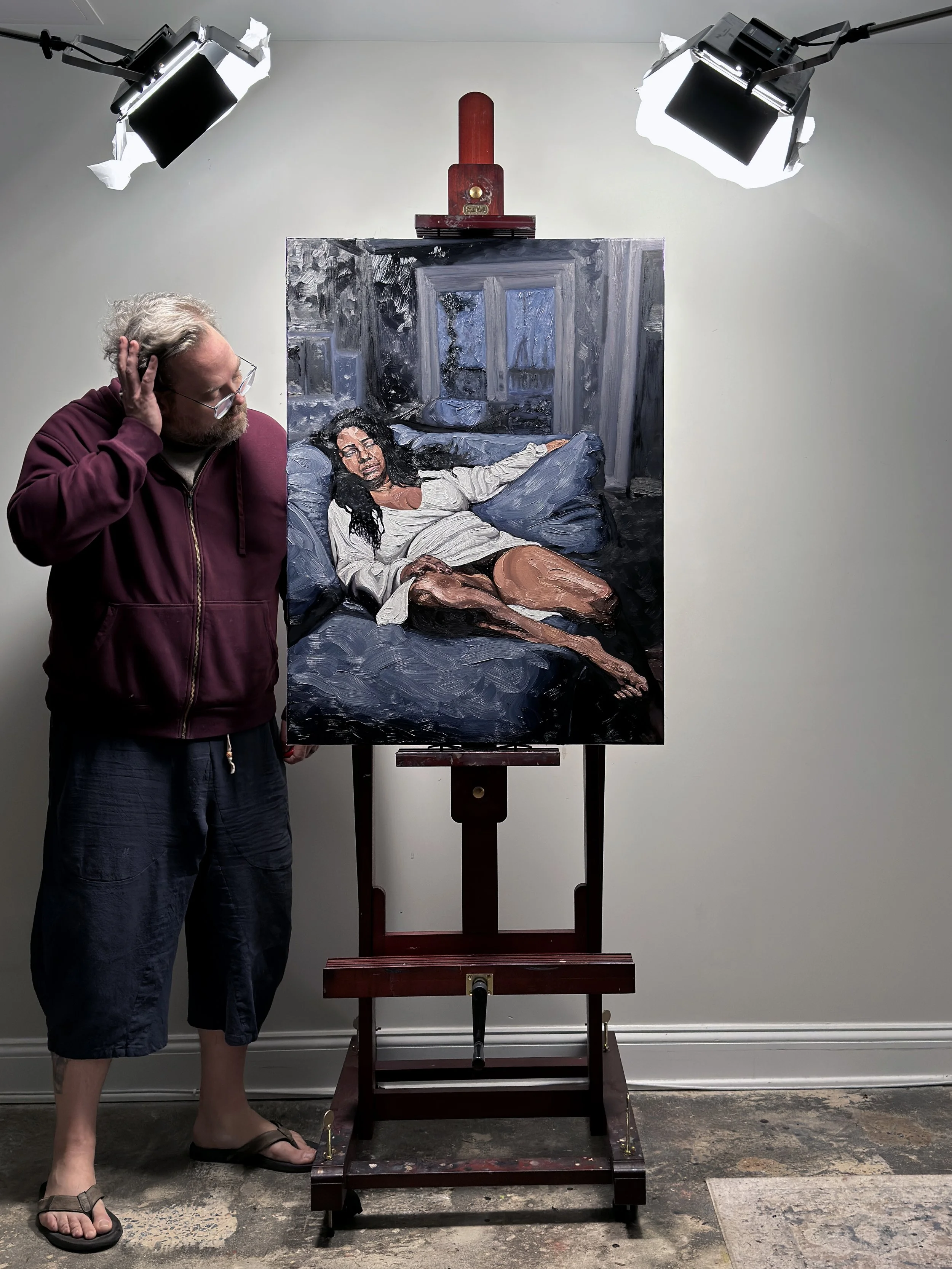 2023 was the year everything changed. A cancer diagnosis shifted my perspective, and painting became not just an artistic practice, but a necessity. I fully committed to working with live models, allowing their presence and our conversations to shape each piece. This was also a very prolific year—what had once been a hobbyist exploration of craft turned into a relentless dedication to the artform, producing more work than ever before. Titles became inspired by my conversations with the model, compositions became more narrative, and the canvas better communicated these intimate experiences.